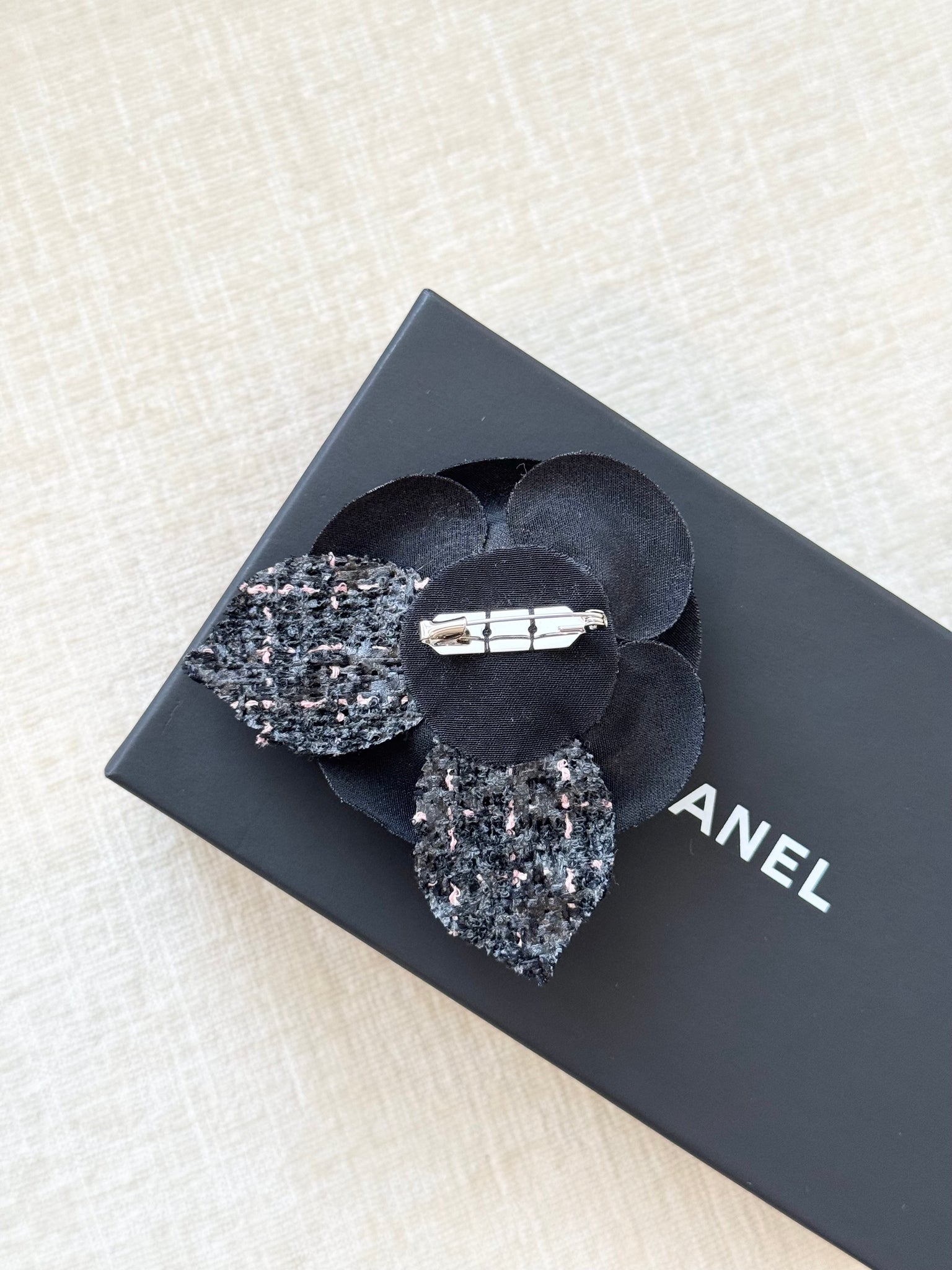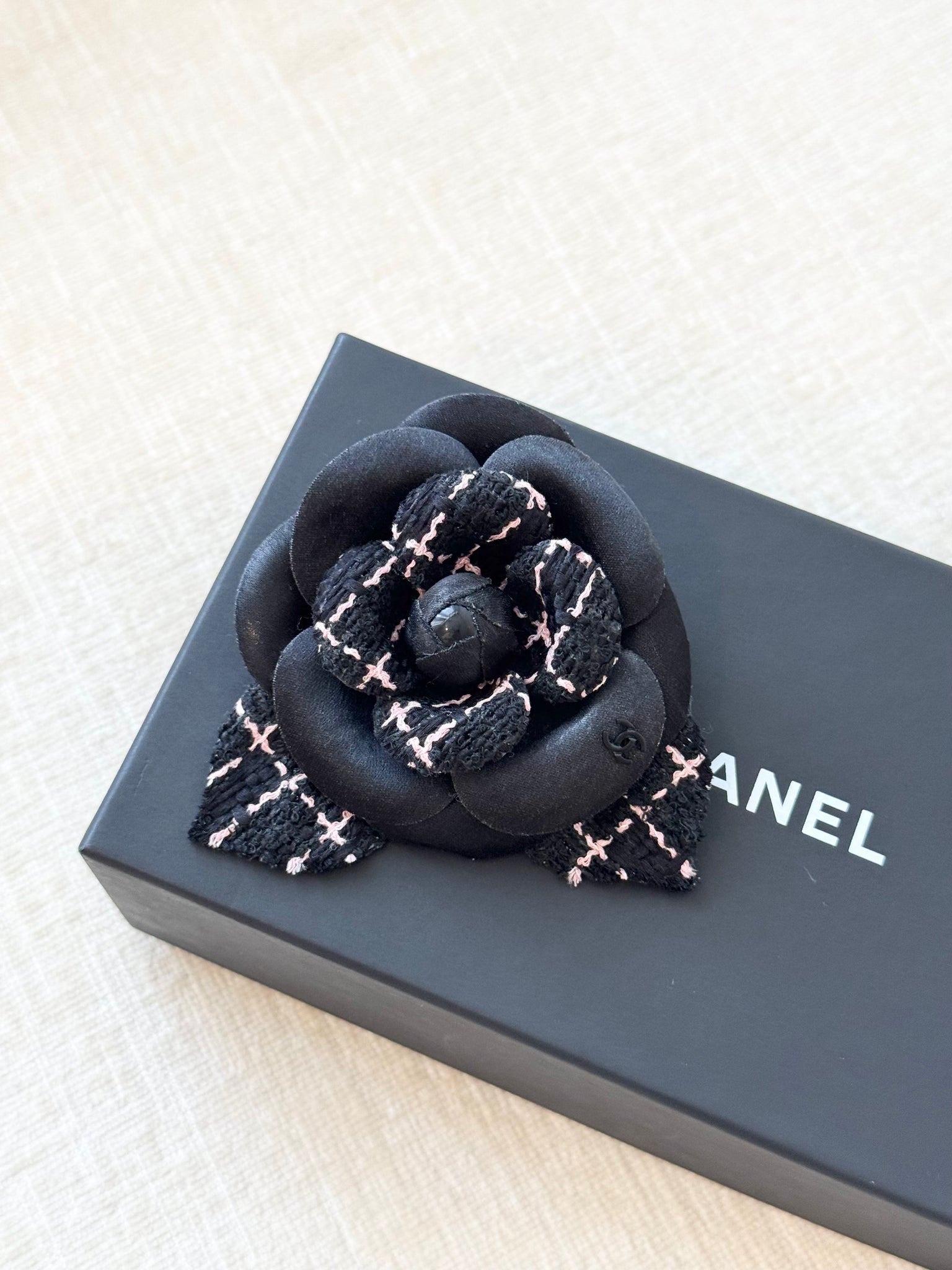 CHANEL Tweed Fabric Camellia Pin Brooch / Black / Pink