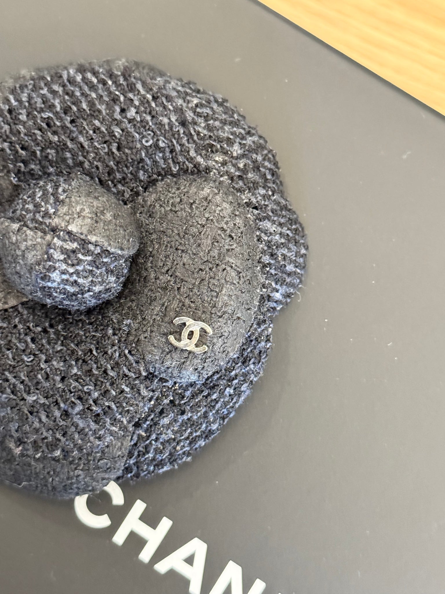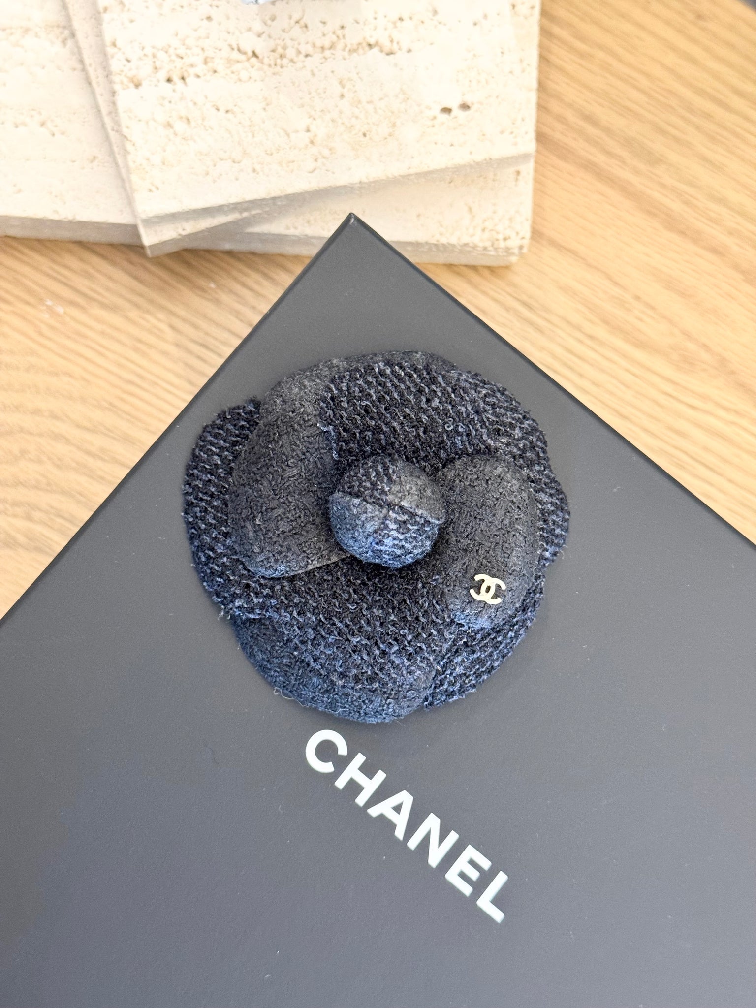 CHANEL Tweed Fabric Camellia Pin Brooch in Black