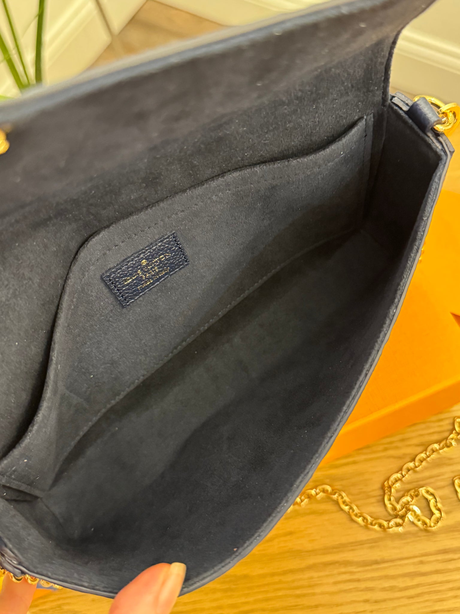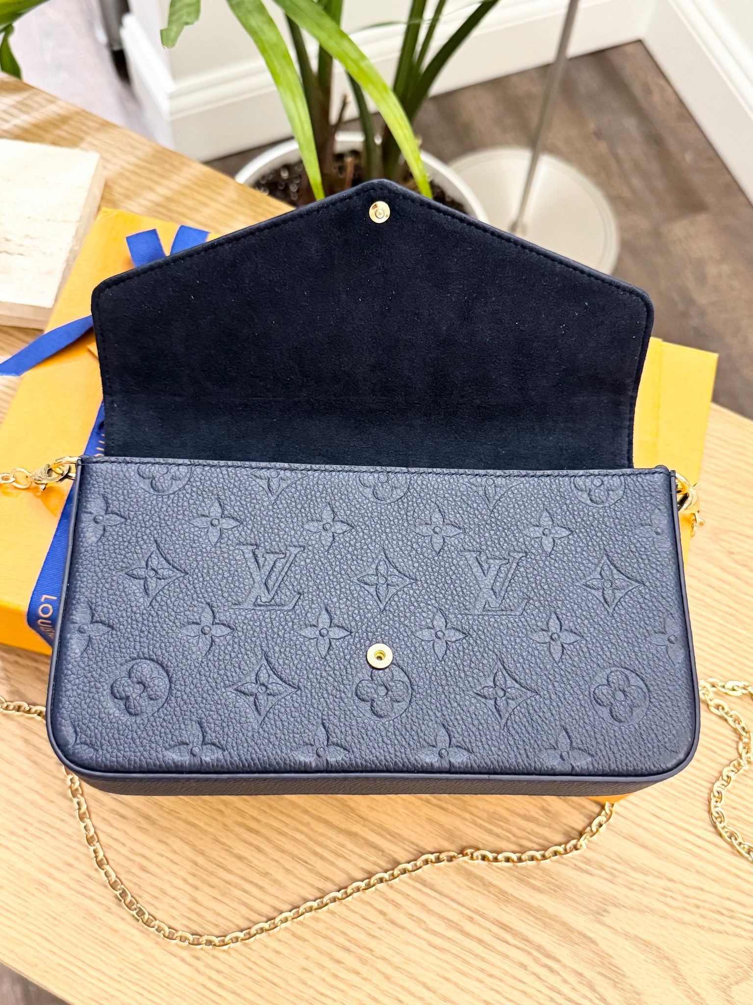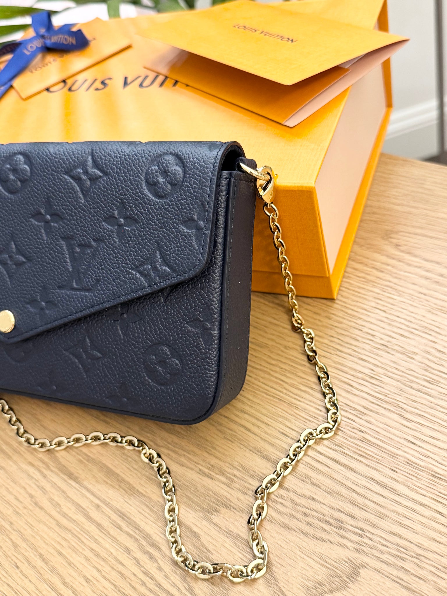 LOUIS VUITTON 2024 Félicie Pochette Empriente Leather Chain Crossbody Bag - Navy